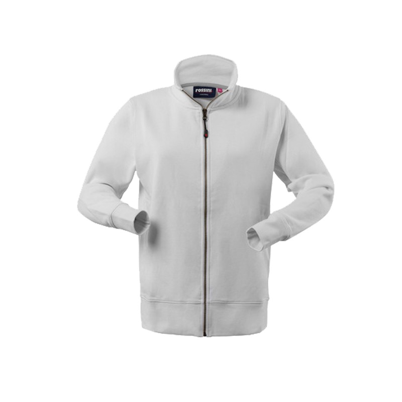 Felpa in cotone (80%) e PL (20%) da donna con chiusura anteriore con cerniera centrale, collo alto, parasudore di colore a contrasto interno al collo, polsi e fascia girovita in maglia elastica, due tasche inferiori a filetto. Su ordinazione tutte le taglie da XS a XXL.