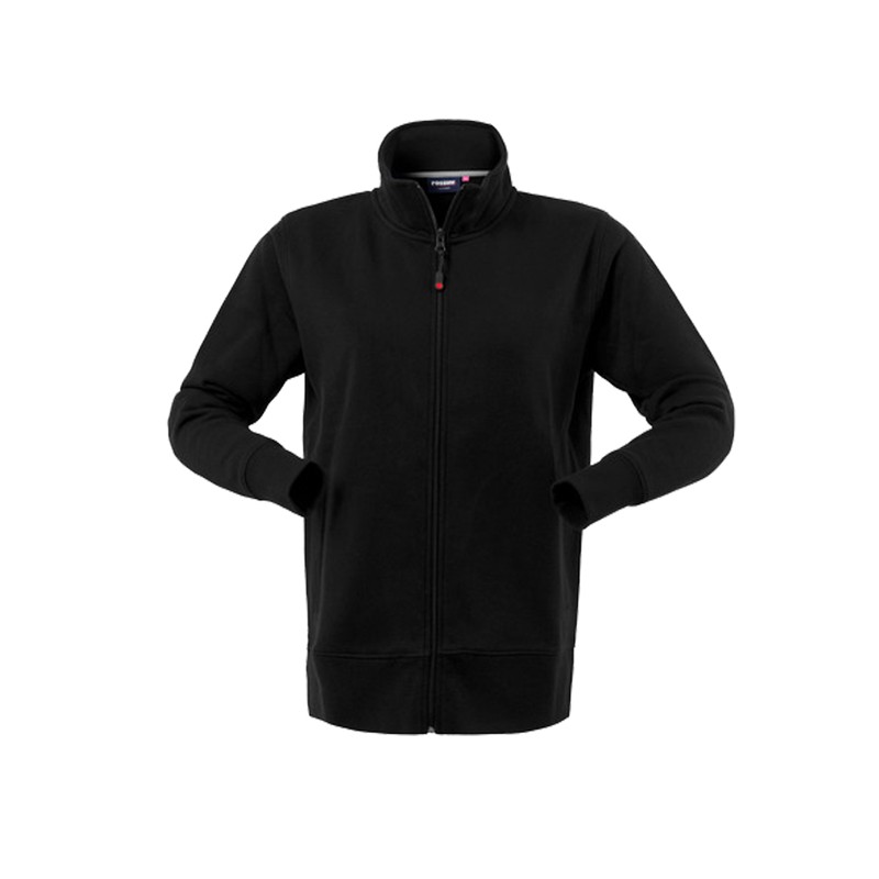 Felpa in cotone (80%) e PL (20%) da donna con chiusura anteriore con cerniera centrale, collo alto, parasudore di colore a contrasto interno al collo, polsi e fascia girovita in maglia elastica, due tasche inferiori a filetto. Su ordinazione tutte le taglie da XS a XXL.