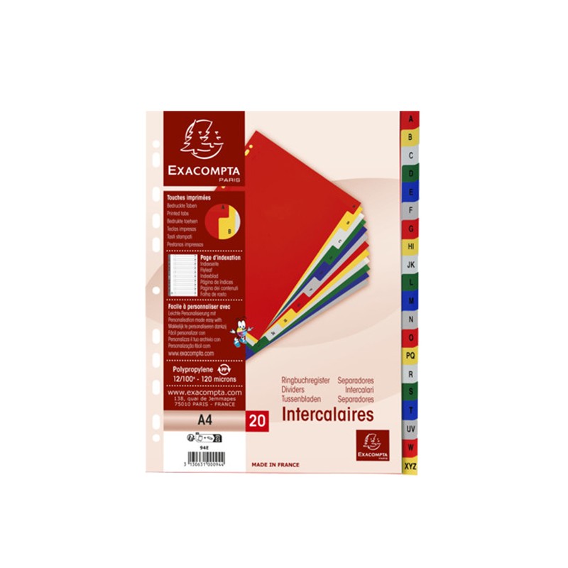 Divisori con 20 tasti alfabetici A-Z, ideale per organizzare e archiviare informazioni importanti, appunti o documenti scolastici, per l'uso a casa, a scuola o in ufficio. Polipropilene colorato 120 micron. Frontespizio stampabile per identificazione del contenuto. Tasti prestampati dalla A alla Z per dividere in ordine alfabetico. Perforazione universale per una facile archiviazione in tutti i tipi di raccoglitori. Per formato A4.