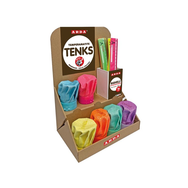 Display da banco con 24 temperamatite a 3 fori Tenks Glitter e 24 righelli 16cm colori fluo assortiti.
