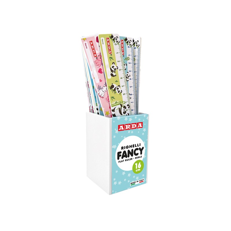 Barattolo con 24 righelli da 16cm, colori e fantasie assortite.
