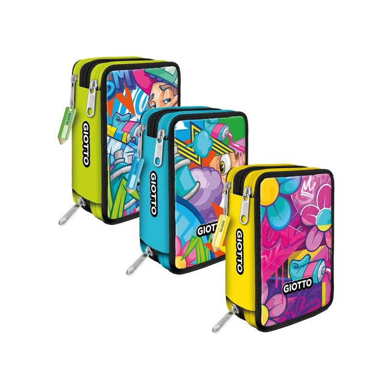 Astuccio a 3 scomparti in poliestere 900D impermeabile dotato di cerniera in metallo. Contenuto: 1 colla stick da 10gr, 1 righello 15cm, 1 maxi gomma No-Sign, 1 temperamatite c/serbatoio, 1 forbice, penna Tratto Cancellik rosso e blu, 1 penna Tratto Uno Green nero, 1 matita HB, 1 Matita 2B, 18 pennarelli Turbo Color e 18 pastelli Supermina 4mm.