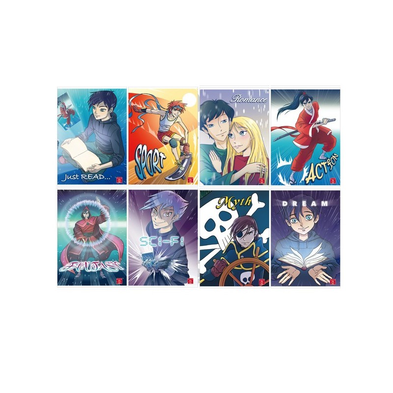Maxiquaderno rilegato con punto metallico. Copertina in cartoncino da 205gr verniciatura UV. Risguardo personalizzabile stampato fronte e retro. Fantasie assortite 2024.
