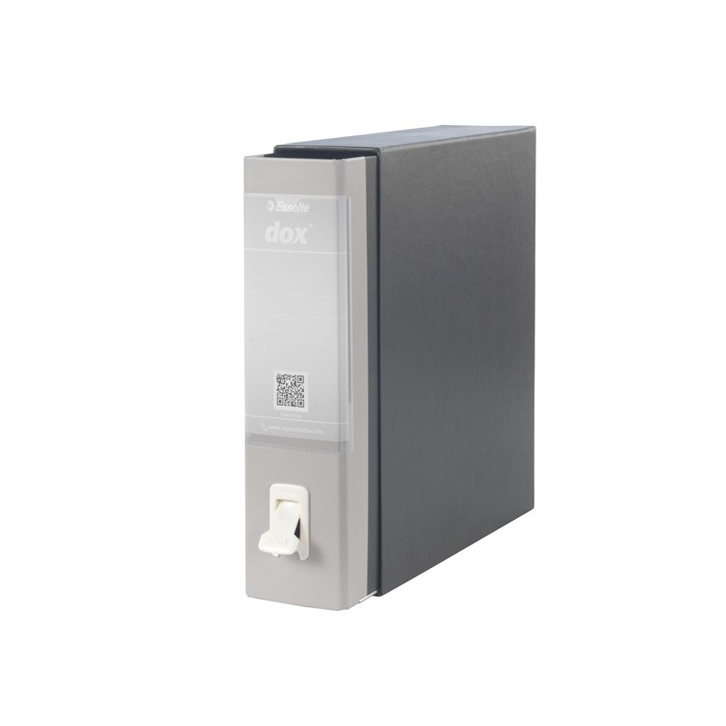 Registratore Dox® 1 dotato di linguella per l'estrazione a scomparsa 3 volte più resistente, caratterizzata da un design con presa più ergonomica, più agevole e arrotondata (l'area rientrante suggerisce il gesto per estrarre correttamente). Struttura in cartone rivestito con carta goffrata antimpronta e rifinito con paralati metallici alla base della plancia. Custodia in fibrone rivestito con carta nera goffrata trattata antimpronta, interno nero e parabordi verniciati. Meccanismo a leva in acciaio nichelato con pressino. Dorso in materiale plastico colorato e portaetichette trasparente con etichetta reversibile. Ogni dox possiede al suo interno un volantino con il codice QR da applicare sull'etichetta e 3 semplici indicazioni per scaricare la app dedicata su App Store e Google Play. Dox infatti si trasforma in registratore intelligente grazie a mydox app, la soluzione facile e immediata per archiviare e reperire documenti (tutte le informazioni sono disponibili sul sito www.myesseltedox.com). Formato commerciale (LxH) 23x29,7 cm. Dorso 8 cm. Colore grigio chiaro. Dimensioni 85x315x288 mm.