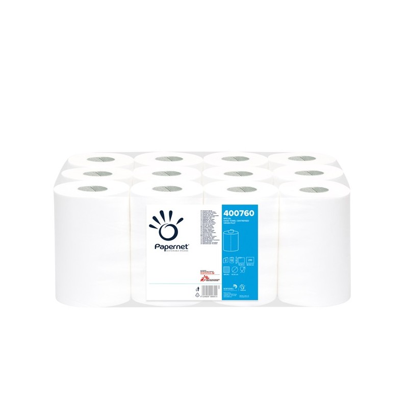 Asciugamani in rotolo Centrefeed ad estrazione interna in pura cellulosa, microgoffrato. 2 veli da 18gr, altezza rotolo 20,9cm, diametro rotolo 14,5m. Lunghezza carta 77mt, 218 strappi da 20,9x36,5cm.