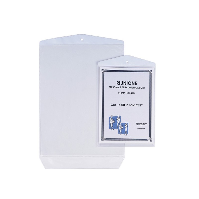 Buste porta avvisi in PVC con foro rinforzato per appendere e patella di chiusura dal basso. Ideali per proteggere dalla polvere e dall'umidità, istruzioni, avvisi, tabelle, licenze, menu, informazioni pubbliche.Formato contenuto 230x330 mm.