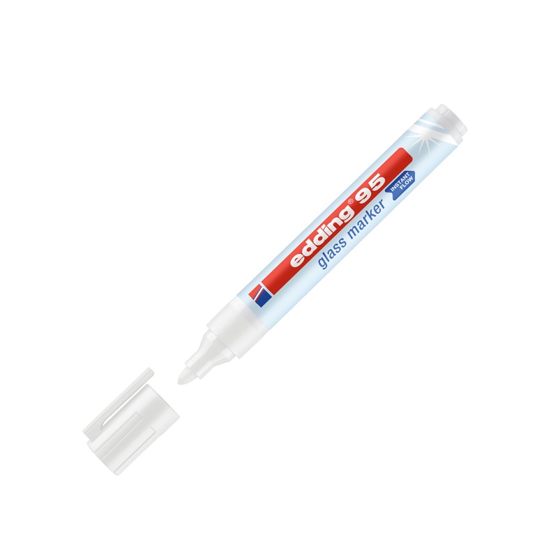 Marcatore pronto all'uso con flusso istantaneo, punta tonda tratto 1,5-3 mm, specifico per superfici in vetro, specchi, lavagne in vetro ma perfetto anche per scrivere su lavagne bianche e per contrassegnare parti di carrozzeria e parabrezza che necessitano di riparazioni. Non occorre attivarlo mediante pressioni sulla punta. Facilmente cancellabile a secco senza residui. Inchiostro coprente e brillante, resistente alla luce.