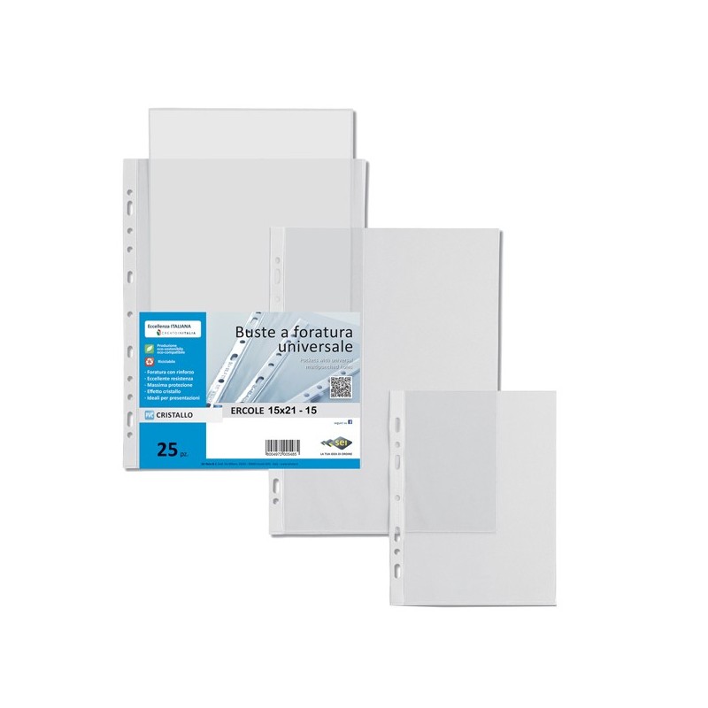 Buste forate realizzate in PVC trasparente cristallo super resistente, con foratura universale. Formato 15x21cm. Confezione da 25 buste.