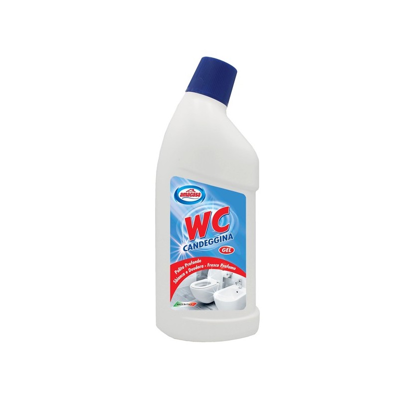 Detersivo specifico per WC e sanitari. Pulisce a fondo grazie ai suoi principi attivi che eliminano le incrostazioni lungo le pareti del WC, rendendole deodorate e profumate. La forma del tappo, a getto direzionale, consente di raggiungere i punti più difficili dei bordi, aderendo completamente e durando a lungo, donando al water la certezza dell’igiene. In flacone in PHED colore bianco. Tappo salva Bimbo in PP colore blu con sotto tappo erogatore