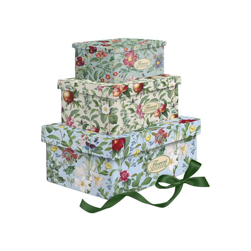 Set scatole regalo in robusto cartone in 3 formati diversi, incluso nastro decorativo. Dimensioni: 20x14,5x8,5cm, 23x16,5x10cm e 26x18,5x12cm.