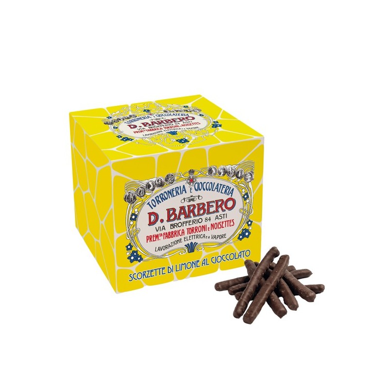Scorzette di limone candite "Agrimontana" tagliate artigianalmente a filetti origine Calabria, ricoperte di cioccolato fondente in scatola da 150gr.
