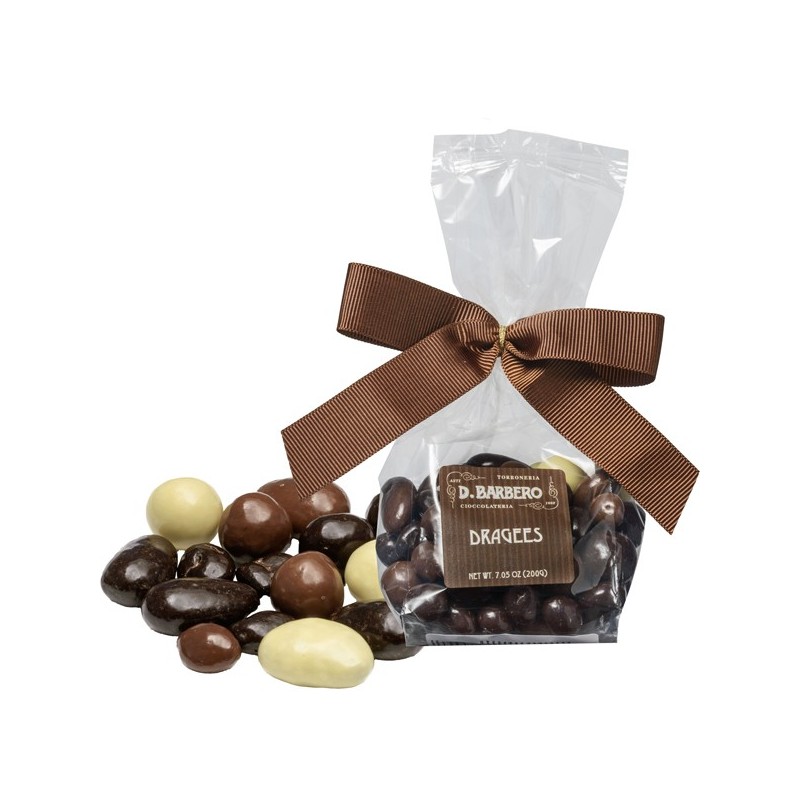 Dragées di nocciole, mandorle, chicchi di caffè e scorze d'arancio ricoperti di cioccolato al latte, fondente e bianco, in sacchetto 200gr.