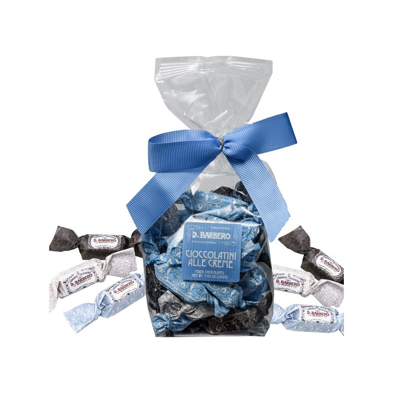 Cioccolatini misti ripieni alle creme in sacchetto da 200gr. Composti da un guscio di cioccolato extra fondente che racchiude un ripieno di creme al torroncino, alla mandorla, alla nocciola e al caffè.