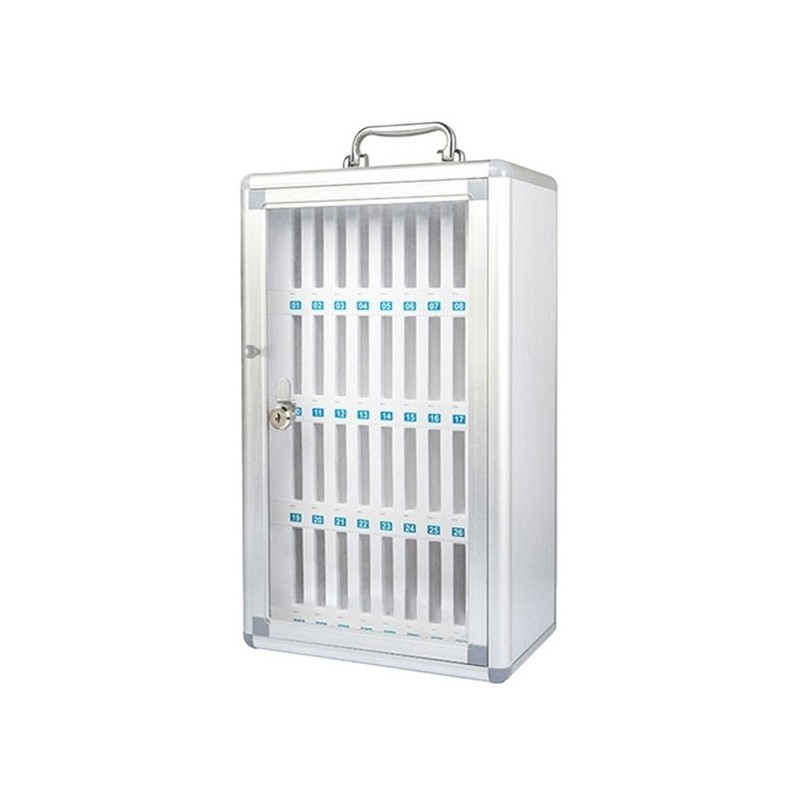 Struttura esterna in lega di alluminio, interno in MDF, pannello porta di apertura in acrilico trasparente e serratura a chiave, con 2 chiavi in dotazione. Celle numerate e personalizzabili. Maniglia in metallo per trasporto. Può essere fissato a parete (tasselli inclusi). Indicati per le scuole, in riferimento alla circolare ministeriale n. 0107190 del 19/12/2022.