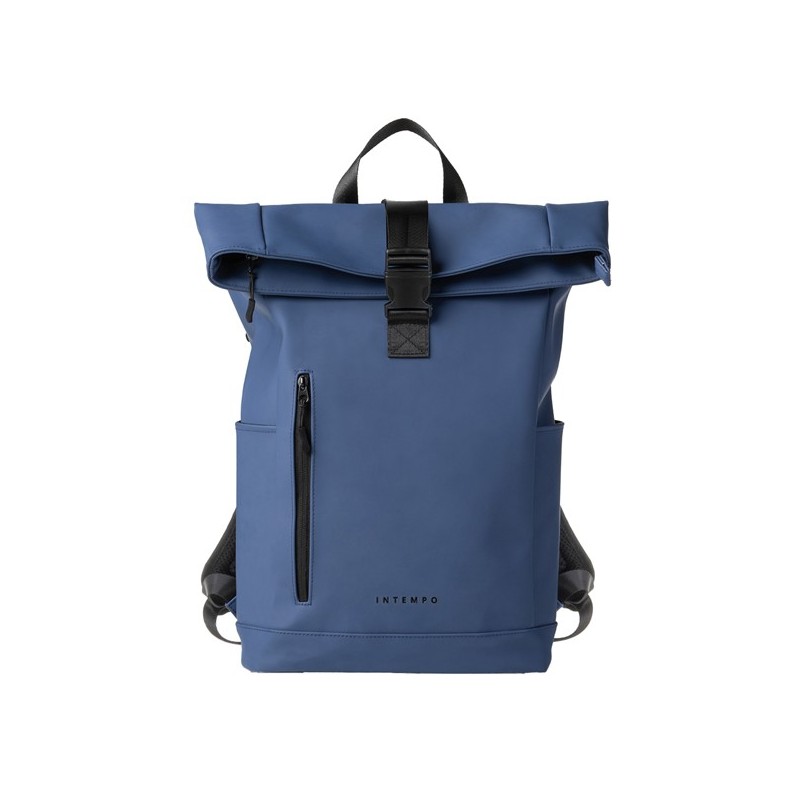Zaino Roll-top realizzato con materiale gommato resistente all'acqua e idrorepellente. Dotato di grande vano centrale e tasce laterali. Chiusura superiore con zip e moschettone. Incluso guscio porta notebook 15".