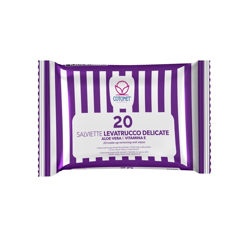 20 salviette levatrucco delicate con aloe vera e vitamina per la pelle del viso. Rimuovono facilmente il trucco rinfrescando e idratando la pelle senza bisogno di risciacquare. Dermatologicamente testate.