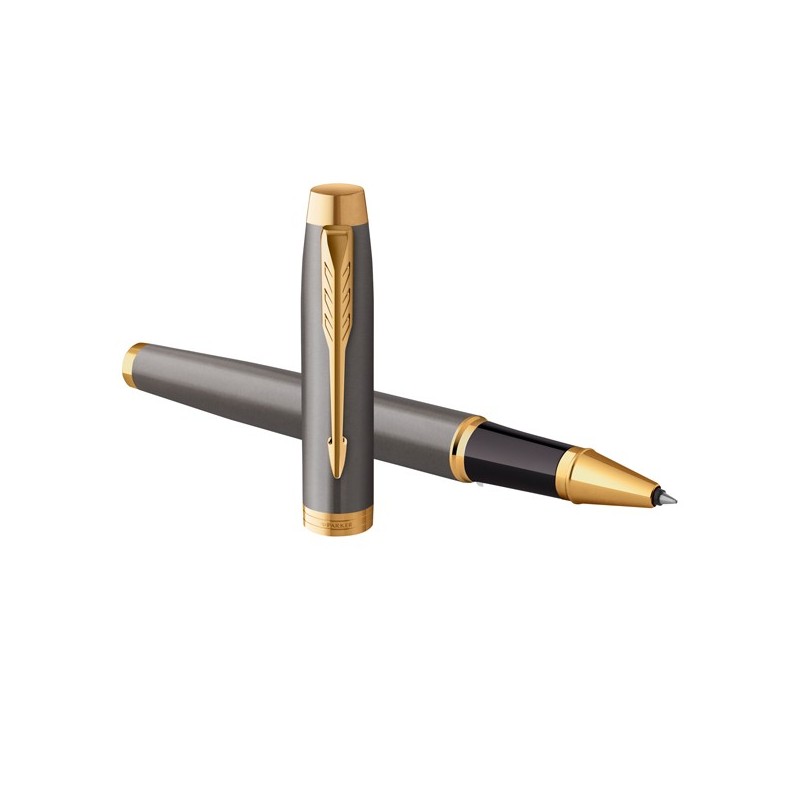 Elegante penna roller dotata di fusto in acciaio inox laccato grigio arrichito da dettagli in oro. Incluso refill nero. Fornita con esclusivo astuccio Parker.