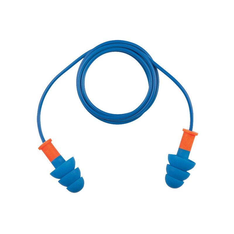 Confezione da 50 paia di inserti auricolari in TPR rilevabili e riutilizzabili con cordino in plastica. Inserti in ferro e ottone, i deali per l'industria alimentare. Utilizzabili con o senza cordino. Taglia unica. Colore: blu. Settori: Produzione / Lavorazione - Hotel e ristoranti - Pulizia. Certificazioni: CE, EN 352-2, ANSI S3.19.