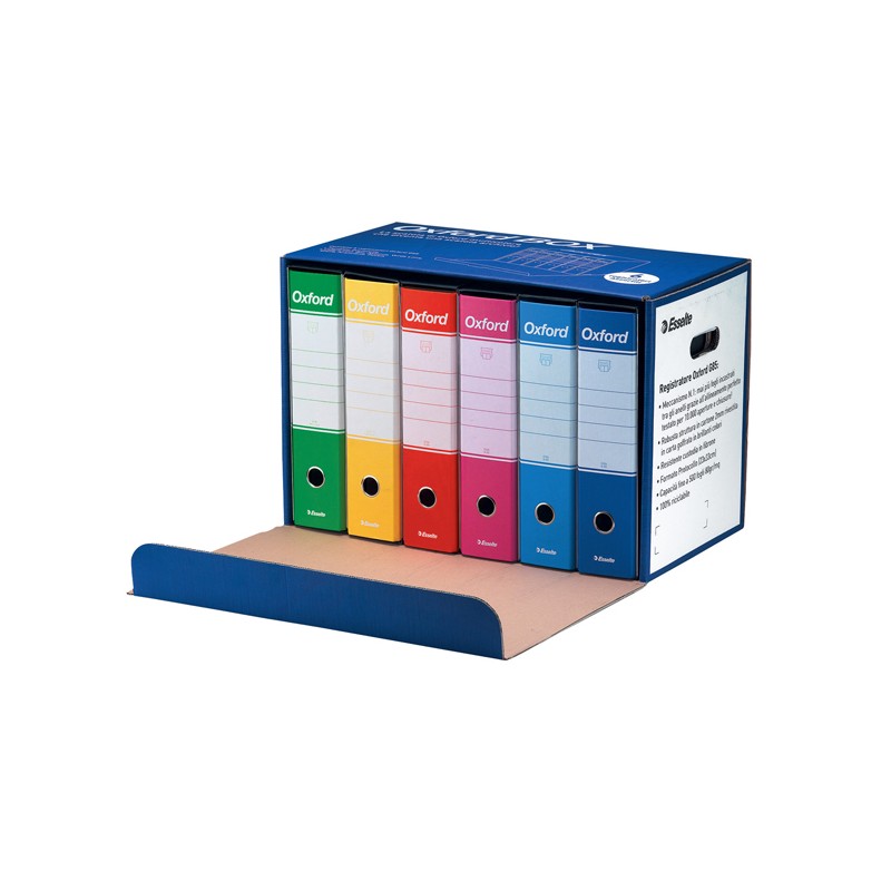 I 6 colori disponibili sono i seguenti: verde, giallo, rosso, fucsia, azzurro e blu Pratica confezione di 6 Registratori Esselte in colori assortiti, riutilizzabile come scatola archivio per differenti scopi. I 6 registatori OXFORD G85 sono adatti all'archiviazione di un massimo di 500 fogli da 80 g per m² per ciascun registratore, in formato 23x33, sono comodi da utilizzare e facili da organizzare. I registratori sono prodotti in Italia e certificati FSC Mix. Personalizzazione sul fronte per identificare il contenuto dei registratori. Massima eleganza per un archivio griffato Oxford.