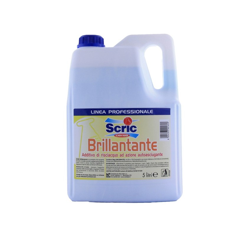 Scric brillantante per lavastoviglie in tanica da 5 litri. Additivo brillantante ad azione auto asciugante. Scric Brillantante è un prodotto che consente di avere stoviglie asciutte rapidamente, brillanti, come nuove e senza macchie, impedendo il deposito dei sali di calcio contenuti nell’acqua.