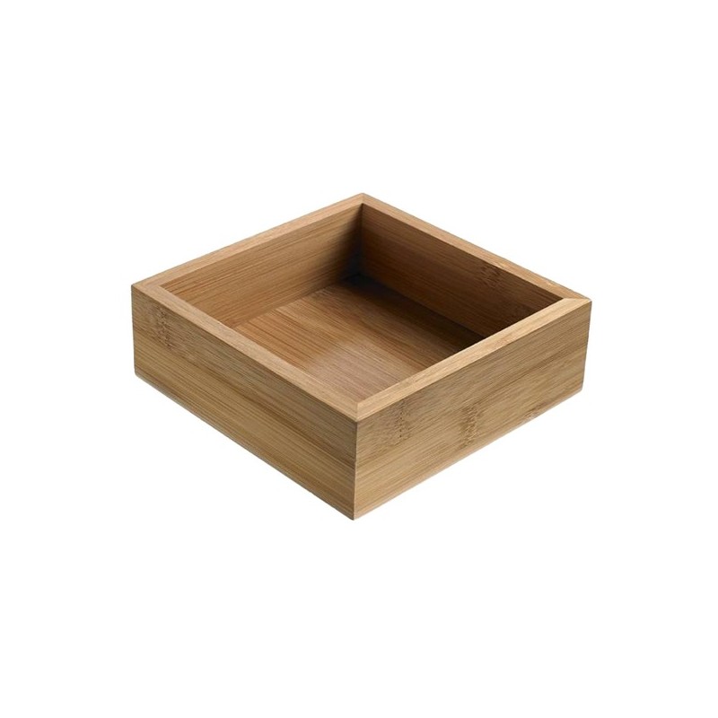 Contenitore buffet in bamboo. Dimensioni: 15,3x15,3x5cm. Idoneo al contatto con tutti tipi di alimenti. Lavabile a mano.