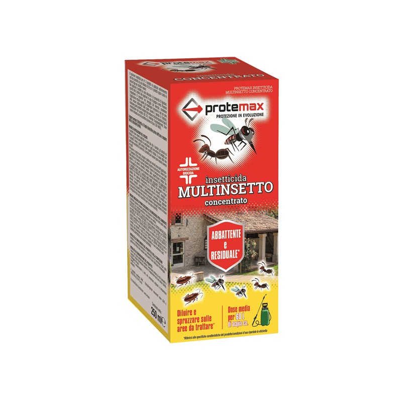 Insetticida concentrato emulsionabile a base di Cipermetrina.Indicato per: il controllo degli insetti striscianti in ambienti interni (quali, ad es., abitazioni, magazzini, ecc.) e per l’eradicazione di nidi di formiche all’esterno. La formulazione è priva di composti organici volatile e, grazie alla presenza della Cipermetrina, è dotata di un rapido effetto abbattente ed un potere residuale che dura fino a 4 settimane. PROTEMAX INSETTICIDA MULTINSETTO CONCENTRATO può essere utilizzato efficacemente anche per il controllo della zanzara tigre all’esterno di aree rurali. Dose media: da 50ml a 200ml per 10 L di acqua. Composizione: Cipermetrina 10%. Prodotto biocida PT-18 Autorizzazione Ministero della Salute n. IT/2023/00901/BBP DI LIBERA VENDITA