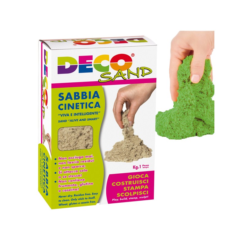 CONFEZIONE DI SABBIA CINETICA DECO SAND DA 1 KG. LA SABBIA È COMPOSTA AL 98% DA PURA SABBIA NATURALE MENTRE IL 2% È COMPOSTO DA UN PARTICOLARE POLIMERO SILICONICO. LA SABBIA NON SPORCA, NON ATTACCA E NON LASCIA RESIDUI. LA MODELLABILITÀ E LA PIACEVOLE SENZAZIONE TATTILE SONO, INOLTRE, INDICATE PER TERAPIE RIABILITATIVE BASATE SULLA MOTRICITÀ FINE. LA SABBIA È COMPLETAMENTE ATOSSICA E PRIVA DI GLUTINE. TEME L'UMIDITÀ E DEVE ESSERE CONSERVATA IN AMBIENTI ASCIUTTI.