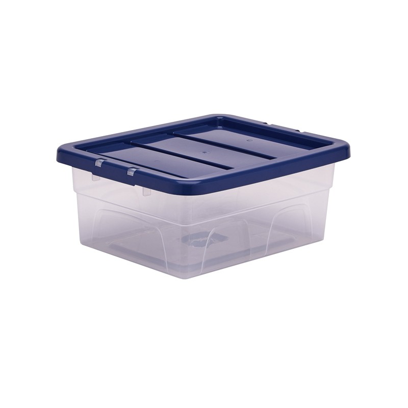 Contenitori multiuso trasparente con coperchio blu, per organizzare il tuo spazio di lavoro o personale. Progettati per annidarsi l'una nell'altra quando sono vuote o per impilarsi quando sono piene. Il coperchio antipolvere, realizzato al 100% con plastica riciclata post-consumo, protegge il contenuto e le chiusure a scatto lo mantengono in posizione. I contenitori sono realizzati in polipropilene 100% privo di BPAe completamente riciclabile.
