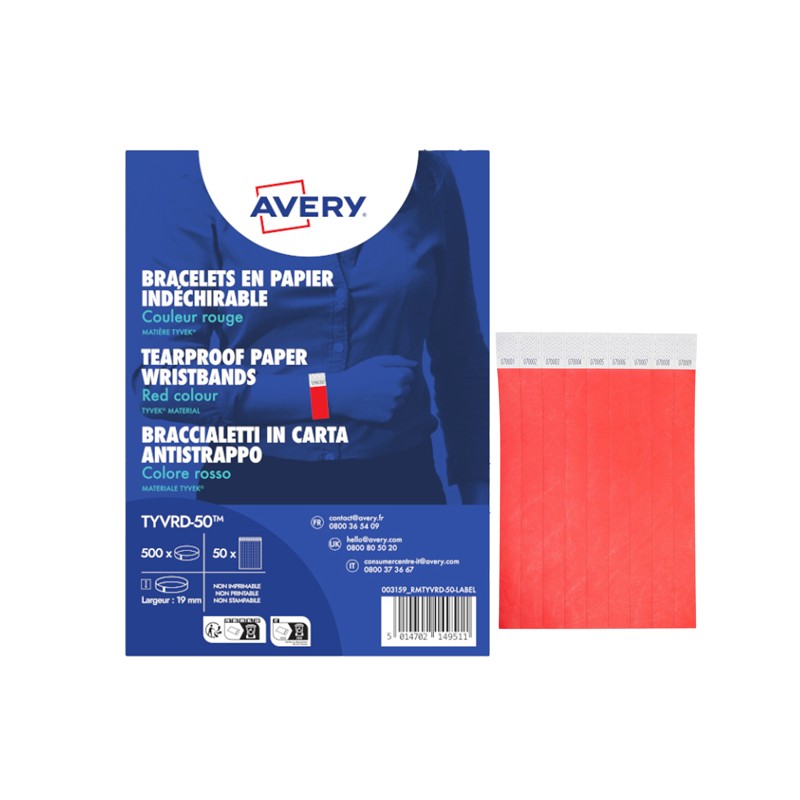 Braccialetti identificativi - in Tyvek - rosso fluo - 265 x 19 mm - 50 fogli - 10 et/fg - Avery - Conf. 500 pezzi