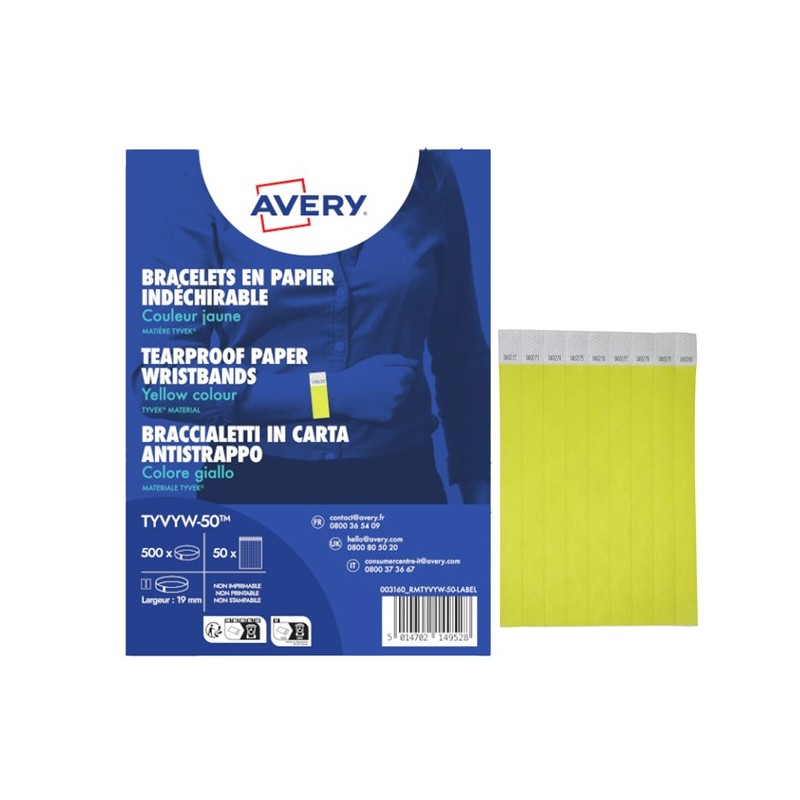 Braccialetti identificativi - in Tyvek - giallo fluo - 265 x 19 mm - 50 fogli - 10 et/fg - Avery - Conf. 500 pezzi