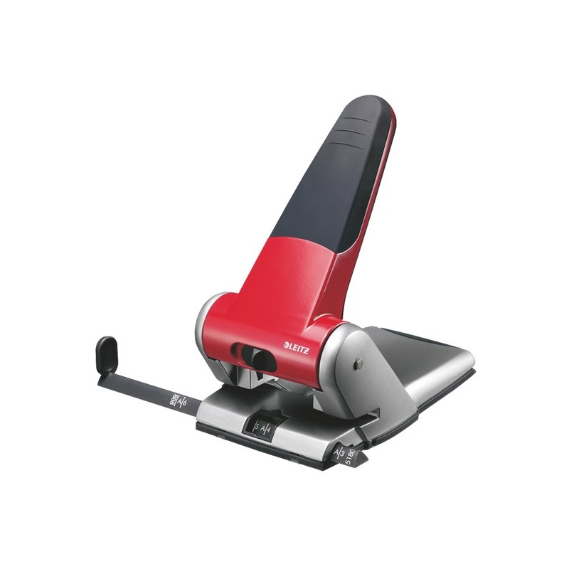 Perforatore a 2 fori passo 8cm con guida regolabile. Forma ergonomica e inserti in gomma soft grip consentono una presa sicura e uno sforzo ridotto per la perforazione. Dotato di dispositivo bloccaggio leva di perforazione. Foro da 5,5mm.