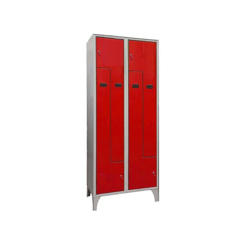 Armadio spogliatoio monoblocco (elettro-puntato non assemblato) su piedi con doppia porta a “L” ogni colonna singola. Struttura portante realizzata in lamiera d’acciaio profilata prima scelta spessore 6/10. N. 2 ante contrapposte per colonna volte ad ottimizzare lo spazio, dotate di canottatura di rinforzo, di fori di aerazione e porta cartellino in materiale plastico. Vano calzature diviso da vano vestiario (maggior igiene). Cerniere interne speciali antiscasso con perno di rotazione interno invisibile ad anta chiusa. Bordo frontale perimetrale arrotondato anti urto raggio mm 6. Nervature longitudinali su fianchi. Asole sul tetto per consentire un’ottima circolazione dell’aria. Trattamento delle superfici: a mezzo fosfato di ferro pesante come preparazione alla verniciatura che avviene per elettrodeposizione anodica con spessore garantito in ogni parte del mobile. Reticolazione a forno a 180°. Vernici: acriliche con elevata resistenza alla corrosione secondo le norme A.S.T.M.B. 117.64 e succ.var DIMENSIONI cm: 80 X 50 X 195 H Peso: kg 43 Volume: mc. 0,78 Vani 8 – ripartizione interna del mobile per colonna: 1 ripiano a tutta larghezza 1 tramezzo divisorio centrale 1 ripiano inferiore a tutta larghezza Tubo ovale in PVC completo di ganci scorrevoli Porta cartellino in materiale plastico applicato all’anta Colore corpo: GRIGIO RAL 7035 Colore ante: ROSSE RAL 3000 Serratura a cilindro con doppia chiave in dotazione.