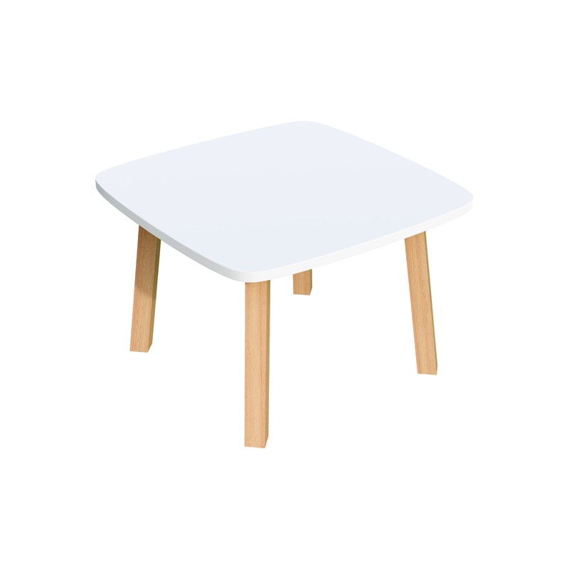 Tavolino Woody in MDF bianco. Gamba del tavolo in legno massello verniciato. Dimensioni:L60 x P60 x H40cm . Ideali per una sala attesa calda ed accogliente.