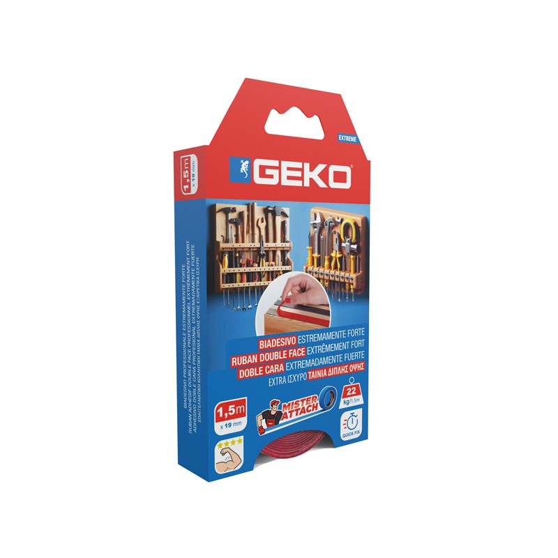 Nastro biadesivo Mister Attach Extreme in schiuma acrilica grigia spessore 0,80 mm con adesivo acrilico sensibile alla pressione su entrambi i lati. Liner: LDPE rosso. Adesivo: acrilico. Principali applicazioni: è specificamente progettato per l'incollaggio permanente in applicazioni interne ed esterne, ed utilizzi industriali. Può sostituire rivettatura, saldatura, colle liquide e altri elementi di fissaggio permanenti. È anche adatto per vari tipi di sostanze, come metallo, legno, vetro e molte plastiche. Buona resistenza a plastificanti, oli, solventi e molto buona resistenza ai prodotti chimici e raggi UV. Ottima resistenza all’umidità. Dimensioni: 19mmx1 ,5m.