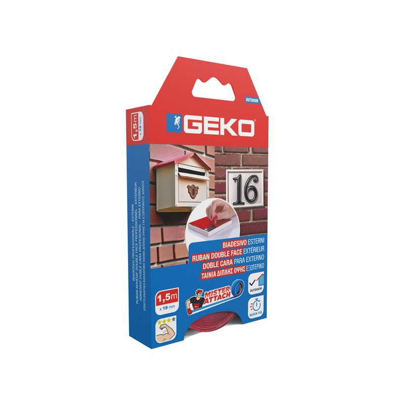 Nastro biadesivo Mister Attach Outdoor in schiuma acrilica grigia spessore 0,80 mm con adesivo acrilico sensibile alla pressione su entrambi i lati. Liner: LDPE rosso. Adesivo: acrilico. Principali applicazioni: È specificamente progettato per l'incollaggio permanente in applicazioni esterne. Può sostituire rivettatura, saldatura, colle liquide e altri elementi di fissaggio permanenti. È anche adatto per vari tipi di sostanze, come metallo, legno, vetro e molte plastiche. Buona resistenza a plastificanti, oli, solventi e molto buona resistenza ai prodotti chimici e raggi UV. Ottima resistenza all’umidità. Dimensioni: 19mmx1,5m.