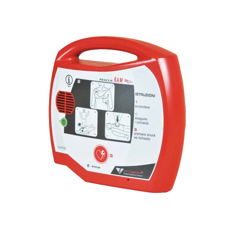 RESCUE SAM è il defibrillatore semi-automatico creato per supportare l’operatore durante le manovre di soccorso con semplici e chiare informazioni vocali oltre che con indicatori luminosi. Dimensioni contenute, peso leggero e batteria non ricaricabile permettono di portarlo ovunque. Ideale per intervenire nelle situazioni di Fibrillazione Ventricolare (VF) e di Tachicardia Ventricolare (VT). I ndicatori vocali e segnali luminosi guidano l’utilizzatore attraverso il protocollo. CLASSE DI PROTEZIONE: IP54 (polvere/acqua) DIMENSIONI: 8x30x27cm PESO: circa 2.2 kg incluso pacco batteria