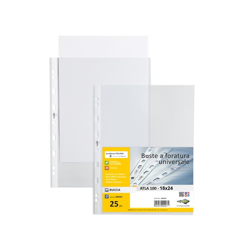 Buste in PP trasparente a buccia d'arancia con spessori medio. Foratura universale rinforzata. Ideali per archiviare qualsiasi tipo di documento. Formato utile 18x24cm.