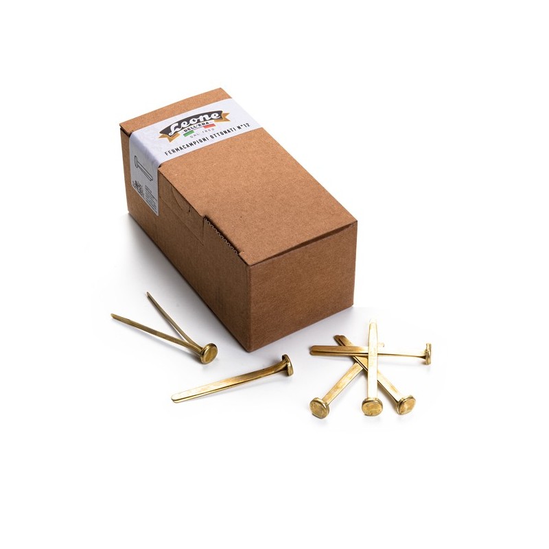 Fermacampioni ottonati. Perfetti nella forma, con una grande testa grazie a una tranciatura e piegatura di precisione. Brillanti e antiruggine grazie a una accurata ottonatura elettrolitica. Confezione da 10 scatole.