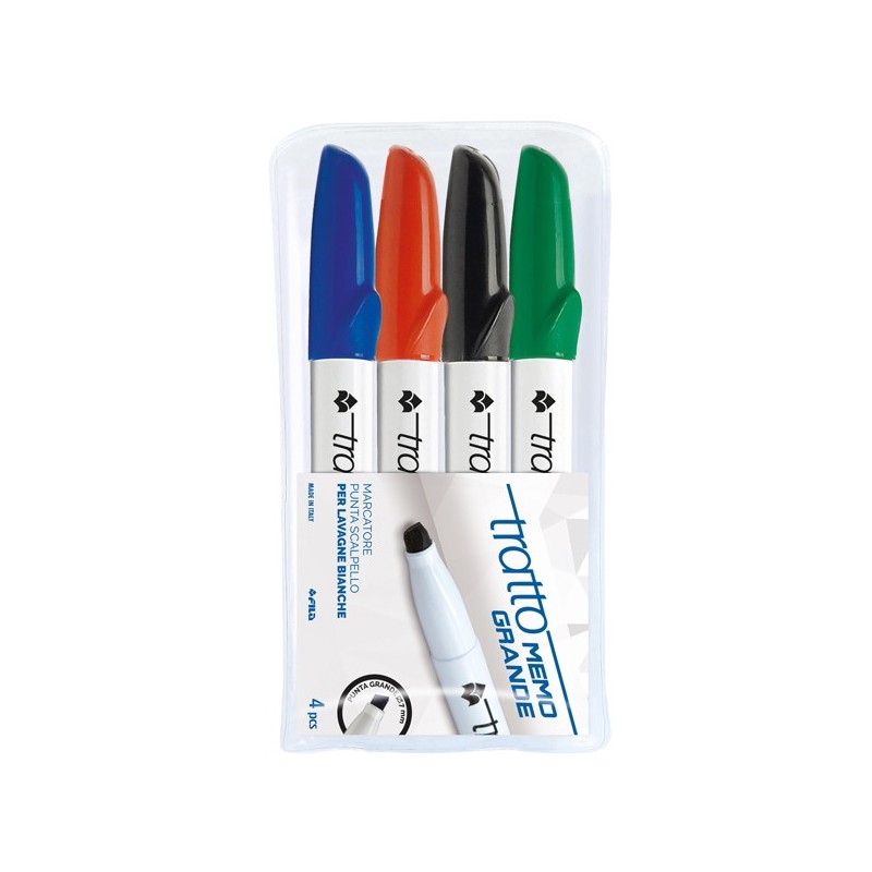 Astuccio 4 colori assortiti. Inchiostro a base d'alcool cancellabile a secco. Cappuccio ad apertura facilitata. Colori brillanti. Punta 6,5mm-scalpello.