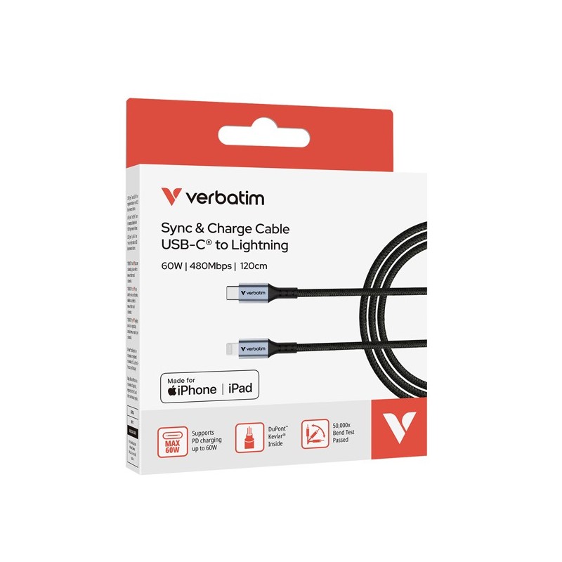 Verbatim Cavo di sincronizzazione e ricarica da USB-C a Lightning_120 cm Certificato Apple MFi che garantisce la compatibilità con i dispositivi Apple Per l'utilizzo con dispositivi abilitati al fulmine come iPhone e iPad Supporto alla ricarica PD: Fino a 60W per la ricarica rapida di iPhone e iPad Velocità di trasferimento dati: Fino a 480Mbps per una rapida sincronizzazione dei file tra dispositivi Apple e USB-C® Fibre interne in fibra aramidica che garantiscono una resistenza superiore del nucleo Spine dei connettori in lega metallica con una maggiore durata Esterno in nylon intrecciato per una resistenza all'abrasione Resiste a oltre 50.000 piegature per una durata eccezionale 120 cm di lunghezza: Perfetto per l'uso a casa, in ufficio o in viaggio