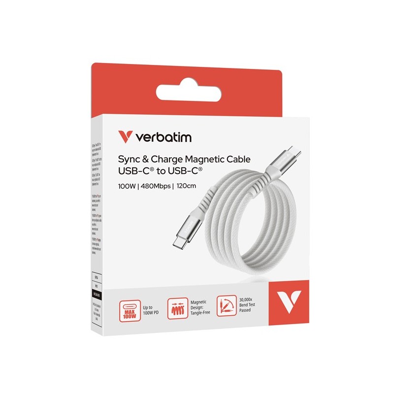 Verbatim Cavo Magnetico Sync <(>&<)> Charge USB-C to USB-C 100W 120 cm_Grigio Erogazione di potenza elevata: supporta fino a 100 W di ricarica rapida e 480 Mbps di trasferimento dati Ampia compatibilità: adatto a una vasta gamma di dispositivi USB-C, dai laptop agli smartphone Design magnetico: rimane arrotolato e senza grovigli per un facile utilizzo e stoccaggio Costruzione robusta: esterno intrecciato e nucleo in rame spesso per una maggiore durata Supporta PD 3.0 e QC 3.0: Pienamente compatibile con i moderni protocolli di ricarica. Compatto e portatile: Perfetto per i viaggi o per l'uso in movimento Interfacce: Connettore USB-C (maschio). Lunghezza cavo: 120 cm. Diametro cavo: 4,6 mm. Materiale: Alluminio, nylon, TPE. Velocità di trasferimento dati: fino a 480Mbps. Potenza in uscita: max. 100W. Supportato: PD 3.0, QC 3.0