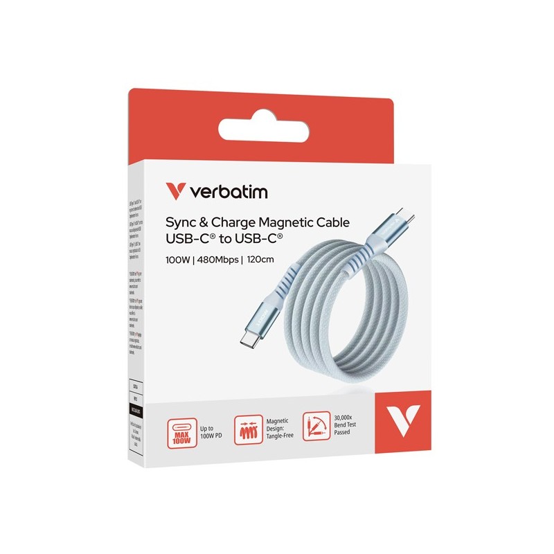 Verbatim Cavo Magnetico Sync <(>&<)>Charge USB-C to USB-C 100W 120 cm_Blu Erogazione di potenza elevata: supporta fino a 100 W di ricarica rapida e 480 Mbps di trasferimento dati Ampia compatibilità: adatto a una vasta gamma di dispositivi USB-C, dai laptop agli smartphone Design magnetico: rimane arrotolato e senza grovigli per un facile utilizzo e stoccaggio Costruzione robusta: esterno intrecciato e nucleo in rame spesso per una maggiore durata Supporta PD 3.0 e QC 3.0: Pienamente compatibile con i moderni protocolli di ricarica. Compatto e portatile: Perfetto per i viaggi o per l'uso in movimento Interfacce: Connettore USB-C (maschio). Lunghezza cavo: 120 cm. Diametro cavo: 4,6 mm. Materiale: Alluminio, nylon, TPE. Velocità di trasferimento dati: fino a 480Mbps. Potenza in uscita: max. 100W. Supportato: PD 3.0, QC 3.0