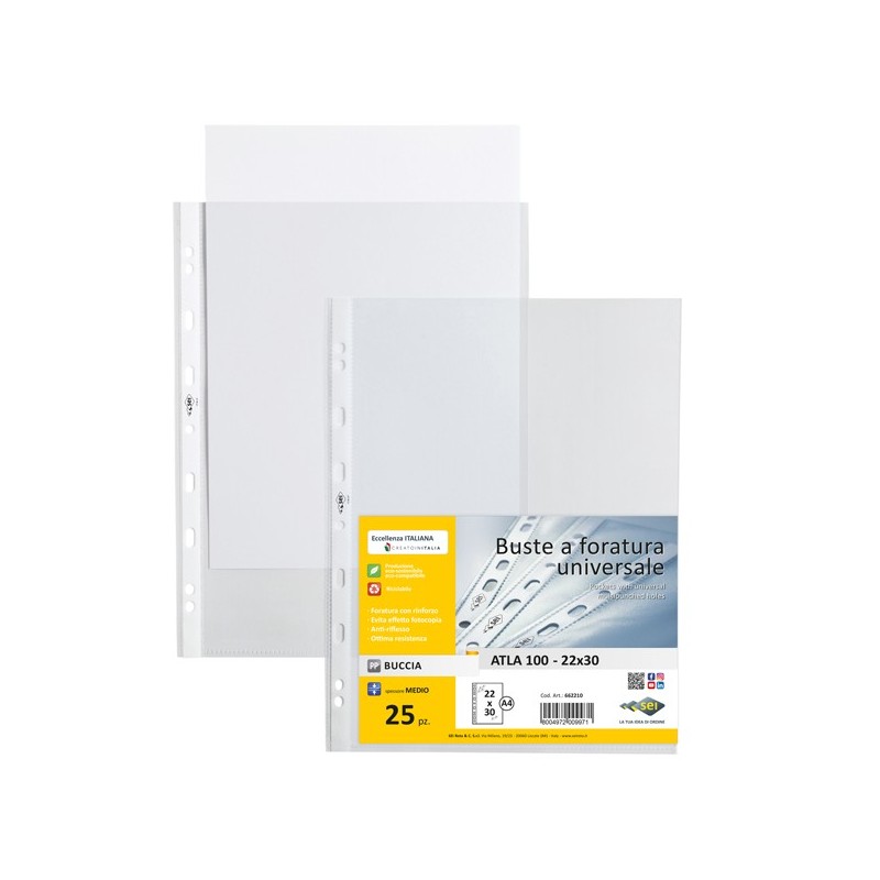 Buste forate in PP a buccia d'arancia con spessori medio. Foratura universale rinforzata. Ideali per archiviare qualsiasi tipo di documento. Formato utile 22x30cm.