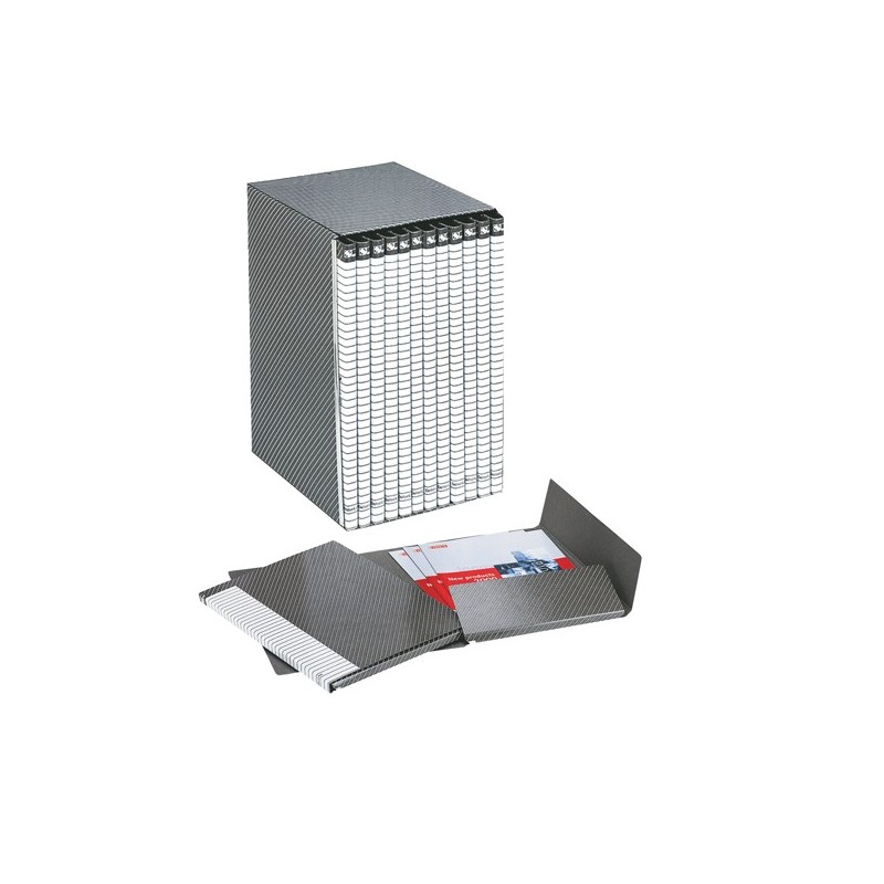 Gruppo Delso Line composto da 12 cartelle a 2 lembi (dorso 1,5 cm; dimensioni 25x32 cm) raggruppate in un'unica custodia e realizzate in robusto fibrone da 1,2 mm stampato e plastificato. La custodia, in fibrone da 0,9 mm stampato, è dotata di bande laterali metalliche di rinforzo che mantengono i bordi perfettamente diritti. Il rivestimento esterno plastificato rende tutta la superficie scrivibile; per cancellare le scritte è sufficiente utilizzare un batuffolo imbevuto di alcool denaturato o acetone. Il taglio obliquo della custodia permette infine una comoda estrazione.