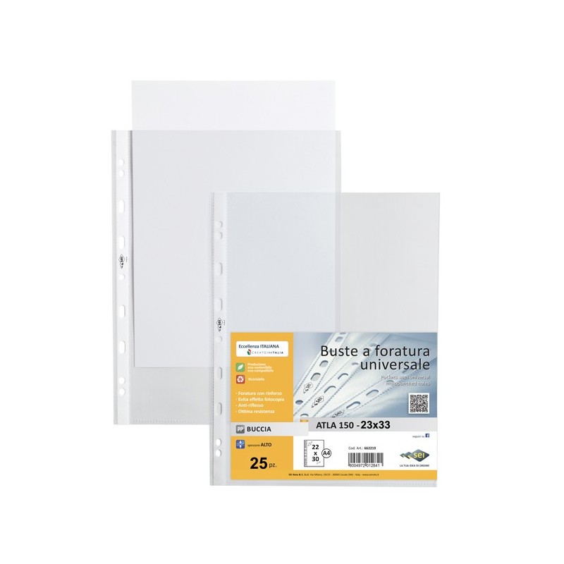 Buste forate in PP trasparante a buccia d'arancia con spessori alto. Foratura universale rinforzata. Ideali per archiviare qualsiasi tipo di documento. Formato utile 23x33cm.