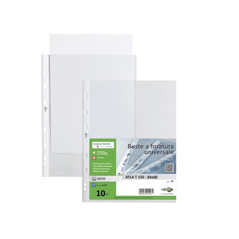 Buste forate in polipropilene trasparente liscio di medio spessore. Foratura universale rinforzata sul lato lungo (verticale). Ideali per archiviare qualsiasi tipo di documento. Formato 35x50cm. Confezione da 10 buste.