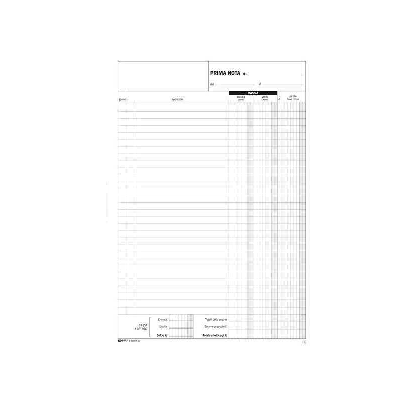BLOCCO PRIMA NOTA CASSA ENTRATE/USCITE. Formato 31x21cm. 50fg. 2 copie ric.