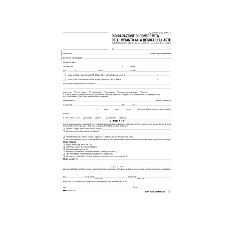 DICHIARAZIONE CONFORMITA'. Formato 29,7 x 21cm. 100 fg. 5 copie snap.