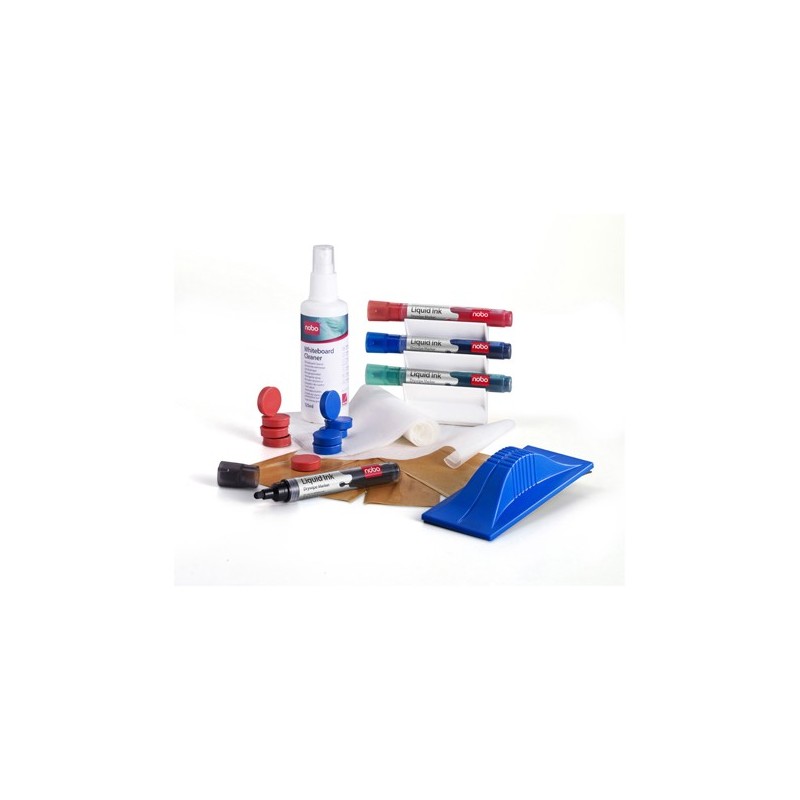 Il kit Nobo per lavagne bianche ha tutti gli accessori di cui hai bisogno per completare la tua lavagna bianca Nobo. Comprende 4 pennarelli cancellabili a secco, un supporto magnetico per pennarello, un cancellino magnetico, 5 ricariche per il cancellino, uno spray per la pulizia da 125 ml con panni e 10 magneti da 10 mm x 25 mm.