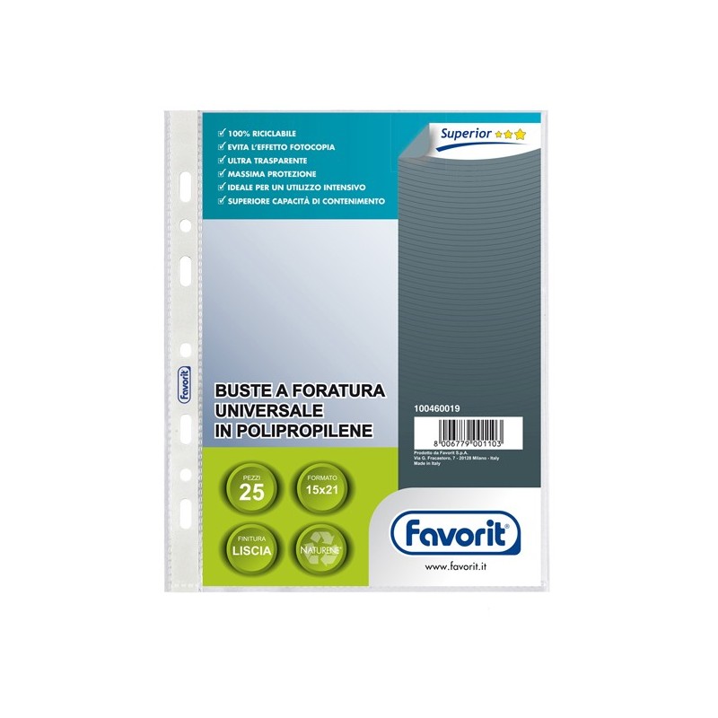 Buste forate realizzate in Naturene (polipropilene) trasparente liscio con foratura universale. Tipologia superior 15x21cm. Confezione da 25 buste. Made in Italy